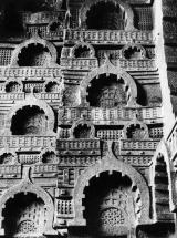 Sculpted representation of wooden architecture with chaitya arches