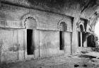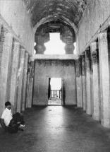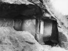 Veranda, left wall, cell door with sloping jambs crowned by caitya arch