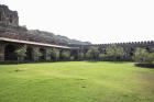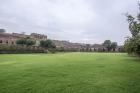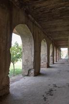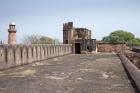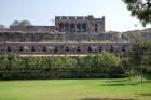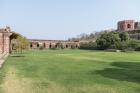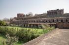 Terrace above the sarai cells with a battlemented parapet, and the Hiran Minar visible in the background