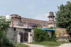 Double-storied Eastern Gateway (Delhi Darwaza) and a modern residence in the foreground