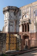 Subject: Left wing of the east facade of the Eastern Gateway (Delhi Darwaza) with engaged octagonal turret, ornate facade with balcony and arched alcove (inscribed)