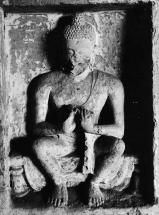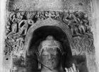 Subject: Architrave showing Indra's, visit to Buddha, back view. This sculpture belongs to the transitional phase, between the Sunga an Kushana periods, when symbol worship was in vogue and anthromorphic form of Buddha was gradually being introduced.
