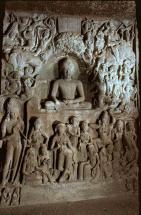 Apex of arch with Seated Buddhas in niches; Enthroned Buddha