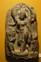 Subject: First gallery, north Facade, upper series: The Naga-king Mucilinda pays homage to the Buddha, left portion: dwarf on head of elephant to right of Buddha