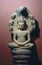 Main Hall, Left wall, center, Sravasti Miracle: Nagas supporting the lotus pedestal of the Buddha