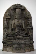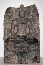 Subject: Buddha in gesture of fearlessness or abhayamudra. This figure stands in high relief against a black slab with a rounded top. The halo's scalloped edge suggest radiating rays.