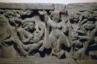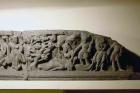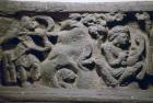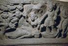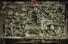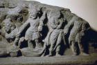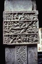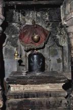 Subject: Kannapar, standing. Kannappa symbolizes the innocent, simple, intense devotion of a simple forest dweller. Kannappa was made the crown prince of his tribe. He once saw a linga on the top of the Kailahasti hill and being told that it was Shiva; he was drawn to it and refused to leave the place. He offered it the flesh of hunted deer, removed the flowers from the linga with his slippers in order to clean it and brought water in his mouth to pour over the Lord. One day Kannappa noticed that one of the eyes of the linga was bleeding, Kannappa plucked one of his eyes and placed it on the linga. The bleeding stopped but the other eye now began to bleed. He was about to remove his other eye with an arrow when he was stopped from doing so by Shiva himself who appeared in person. Kannappa was blessed by the Lord and ever since his innocent love has been immortalized in poetry, religion and art. In this image, Kannappa is shown standing, wearing leather slippers, and the lower garment is made of leather fringed with cowrie shells. The left arm is held in the pose of wielding a bow, while the plucked eye rests on the palm of the right hand. The headdress is like a Jatamukuta but decorated with feathers indicating his status as a forest dweller.