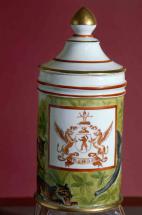 Subject: The state coat-of-arms, featuring the mythical Garuda man-bird and the clan ancestor emerging from flames, is surrounded by the animals that once made Kotah famous for hunting. [Ceramic Covered Jar]