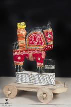 Subject: Elephant. A coir elephant used for decoration and symbolizes prosperity. For coir craft, coir, the fiber removed from the nuts of coconut palms is converted into toys and ornamental objects by tying and folding the fibers together in a zig-zag manner. The figures are made in parts and then joined together. Facial structures are added with colored wool, stitched on the figure. This object has been procured by Utkalika, Odisha State Co-operative Handicraft Corporation Ltd.