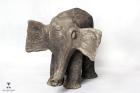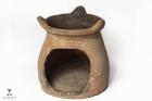 Subject: Buddha seated in dharmacakramudra, turning the Wheel of Dharma gesture. This image was discovered by archaeologist F.O. Oertel south of the Dharmarajika stupa. This seated Buddha is enthroned. The halo behind his head is adorned with concentric bands, the outer one is a richly carved lotus creeper. Flying celestial figures are depicted on either side of the halo, and a pair of leogryphs flank the throne’s backrest. There is a centrally placed wheel, a symbol of the Buddha’s sermon at Sarnath, on the pedestal. Of the kneeling figures on either side of the wheel, the five in monks’ garb represent the Buddha’s first five disciples; while the other two, a woman and child, are probably depictions of the donors.