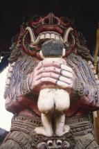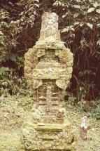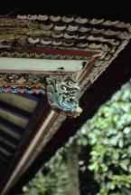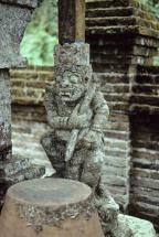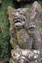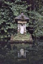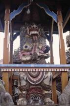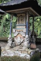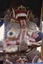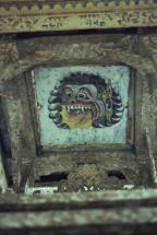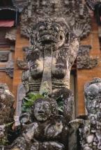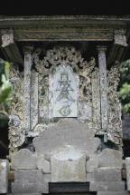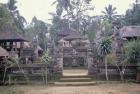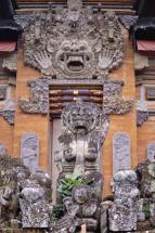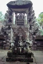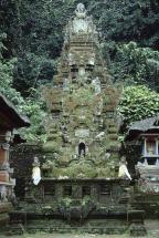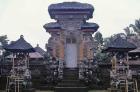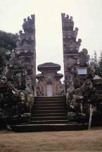 Subject: Gate to third (inner) court; Temple dedicated to Shiva. The sacred barong mask, covered with a white cloth, is stored in the pavilion partly visible to right. Barong is a mythical being who protects the world from being destroyed by Rangda. Their struggle, in which neither wins or loses, is re-enacted as powerful dance ceremonies. They express the belief that darkness and light are both part of life and can not exist without the other.