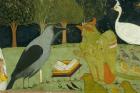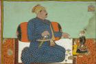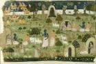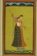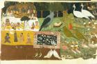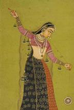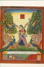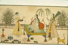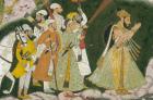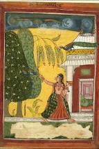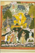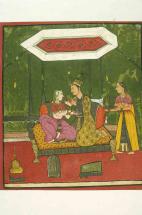 Subject: Left portion, couple on couch; scene reminiscent of Ramakari Ragini: Man attempts to bow down to his lover; male seated at feet of the heroine who is turned away from him in anger and refuses to accept his gesture of courtesy and submission; Vibhasa Ragini