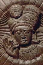 Subject: Worship of the Buddha in the form of a throne and Bodhi tree: Worshippers in center portion, Stupa Vedika (Railing) Entrance, Ajatasatru Pillar, Panel