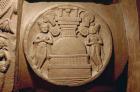 Subject: Upper portion, panel: Worship of the Buddha in the form of a throne and Bodhi tree; Stupa Vedika (Railing) Entrance, Ajatasatru Pillar