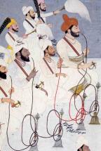 Subject: Bharata arrives at Chitrakuta to persuade Rama to return - Upper right portion, Bharata, one of Rama's brothers, reigned after the King's death and during Rama's absence. Upon Rama's return to Ayodhya, Bharata led the procession to greet the rightful king and queen. Rama and Sita found refuge at Chitrakuta (lit: bright peak).
