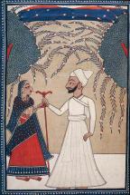 Subject: Upper left portion, landscape with waiting lover in distance [Nayika Going to Meet Lover at Night (Krishna-abhisarika-nayika)]