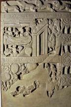 Upper register, panel: Gods requesting Bodhisattva's descent; Upright, Relief Scenes from the Life of Buddha