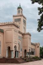 General view, east facade of the mosque with a central arched entrance, colonnaded arcade