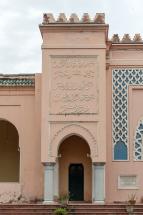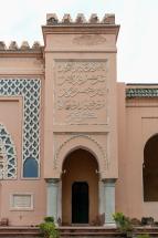 View of the right side with an arched gateway tower with a horseshoe arch supported by columns and an Arabic calligraphy panel above