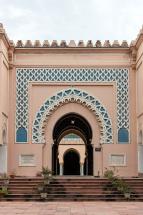 View of the east facade, mosque's central entrance with a horseshoe arch, flanked by arched gateway towers and Arabic calligraphy panels