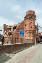 General view, east facade of the eroded triple-storied Northern Gateway (Lahori Darwaza) with corner bastion