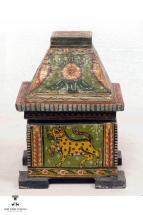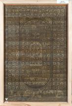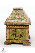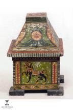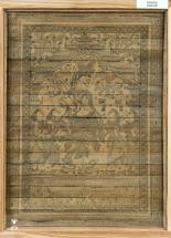 Subject: Krishna-Radha on Kandarpa Ashwa. In this straw craft image Krishna and Radha are on a Kandarpa Ashwa. Kandarpa Ashwa, the heavenly horse, is a popular theme in the context of Krishna Raas Leela where gopis are entangled with each other to form the shape of a horse. Straw craft is created by placing straw strand by strand to form a sheet and then cutting the sheet to create a patchwork for the desired shape. This is pasted onto a black cloth that has been mounted on a board. Images created are usually historical or religious. The Kandarpa paintings portray Krishna with the milkmaids or gopikas who are under the spell of his love, in different formations. This object has been loaned by State Institute for Development of Arts & Crafts (SIDAC).