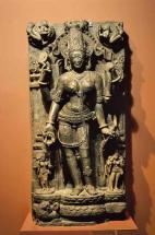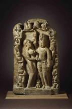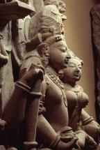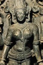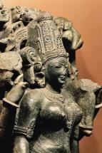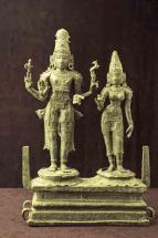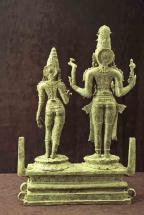 Subject: Jnanasabandar, dancing: An interesting facet of Hinduism on the Tamil-speaking region of south India is the emphasis given to the worship of sixty-three Shaiva saints called nayanmars. The Shaiva saints who lived between the sixth and ninth centuries, were part of a community of holy persons who travelled together across the Tamil countryside, stopping to sing the glories of the deity enshrines at each temple. Through the hymns of the saints, the figure of the distant godhead was humanized. Jnanasambandar heads the list of Devaram singers, his poems on several hundred Shiva temples form the first three books of the sacred Saiva hymns. According to the legend, child Jnanasambandar was once left on the bank by his father. When the father returned, he found the child playing contentedly with a golden cup while trickles of milk ran down his chin, he questioned the source of the cup. By way of answer, the child raised his hand and pointed towards the sky where Uma-Mahesvara appeared to bless both the father and the child. Subsequently the father carried the child on his shoulders from temple to temple with Sambandar singing. Most Saiva temples possess metal images of four Saiva saints-Appar, Sambandar, Sundarar and Manikkavachakar and among these; it is Sambandar who is invariably shown as a child, either standing or dancing. In this image, Sambandar is dancing, one leg lifted, the left arm extended and the right arm pointing up, the image referring to his joyous dance after drinking Parvati?s milk. This is the back view of the sculpted image.