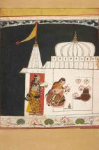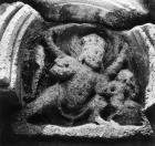 Subject: Bhairava, detail: Bhairava is considered to be one of the violent forms of Shiva. He is so called as he protects the universe (bharana) and is also terrific (bhishana). He carries sula (trident), pasa (noose), damaru (drum) and kapal in his four hands and rides a dog. He is shown nude with a third eye and hair of flames. This is a detail of the face of the figure.