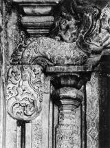 Subject: Shivakamasundari: Parvati stands on a lotus pedestal over a square Bhadra Sana, has a karandamakuta (crown resembling a basket) on her head. She wears makara kundalas in her ears. Her right hand is in the attitude of ahuyavarada (gesture of fearlessness) and the left hand is in lolasana (pendant pose). This is back view of the image.