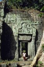 Subject: Fourth Enclosure, East Entrance Pavilion (Gopura), Northern end: Sub doorway; Originally named Rajavihara, Ta Prohm translates to "Old Brahma"; the site is dedicated to the mother of Jayavarman VII, and the main image of Prajnaparamita, the personification of wisdom, is carved in her likeness.