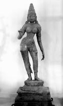 Subject: Sridevi: The figure is a representation of Goddess Sri, the consort of Lord Vishnu distinguished by her breast band. She stands with her left leg slightly flexed; this causes her right hip to sway and is known as the abhanga pose. Sridevi wears a striped and patterned lower garment that drapes around her legs. This figure of Sridevi is affixed to a circular lotus pedestal, which was cast as one piece. The pedestal is mounted onto a rectangular base that has two prongs to enable this figure to be carried during ceremonial or religious processions.