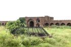 Subject: East facade of the Western Gateway (Lahori Darwaza) with adjoining sarai cells and a well in the foreground