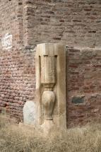 Subject: Carved stone relief of a fluted vase motif set against the brick wall of the Western Gateway (Lahori Darwaza)