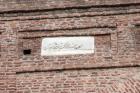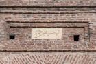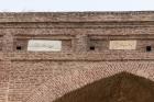 Subject: Detailed view of inscribed panel over the central arch of the Western Gateway (Lahori Darwaza), inscription recording that the sarai was built by Lashkar Khan in 1669 during Emperor Aurangzeb s reign