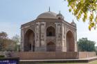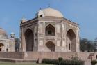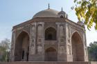 General view, ornate south face of octagonal tomb with domed top and turret on four sides, inscribed