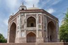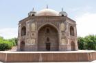 General view, ornate west face of octagonal tomb with domed top and turret on four sides, inscribed