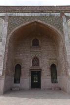 View of ornate west face of sunken high-rise central arch with perforated screens, inscribed