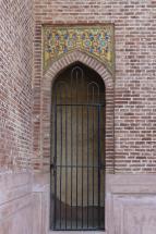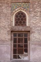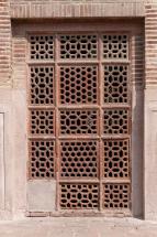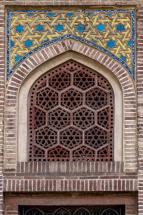 Detailed view of perforated screen with glazed tile decoration on spandrel, inscribed