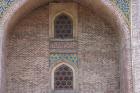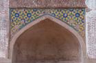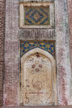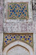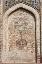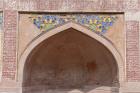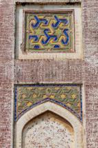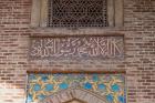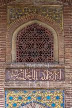 Detailed view of inscription between perforated screens with glazed tile decoration on spandrel
