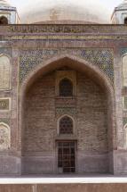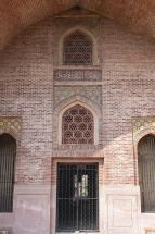 View of ornate north face of recessed arched iwan with perforated screens, inscribed