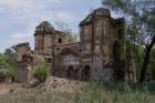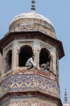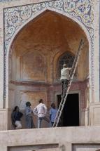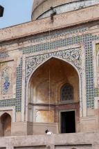 Subject: General view of the west facade of the triple-storied Western Gateway (Lahori Darwaza) with bas-relief motifs and oriel windows, guldastas on top, inscribed