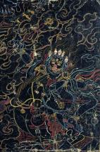 Center portion, Vajrabhairava: Wrathful Vajrabhairava on horse; Vajrabhairava, a tantric manifestation of Manjusri, is a form of Yamantaka, conqueror of Yama, the god of death.