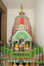 Subject: Dowry Box. Pedis, or dowry boxes are created by chitrakaras and are used to store items of dowries. These are wooden boxes often made of gambhari wood which are covered with cloth canvas and painted over. The boxes may be decorated with scenes from the life of Krishna or they may be decorated with images of musicians and dancers, animals, plants, or other designs. This scene shows Krishna and Balarama seated in a chariot driven by Akrura. They are leaving their home of Brindaban and travelling to Mathura to fight Krishna's uncle Kamsa. The gopis crowd around the chariot, clutching at the wheels, attempting to halt their departure. This object has been procured by State Institute for Development of Arts & Crafts (SIDAC) Show House.