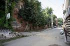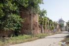 South wall of the sarai enclosure, battlemented parapet and partially overgrown with vegetation