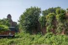 Bastion and arched openings partially covered by creeping vegetation, turrets in the background