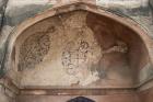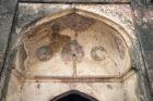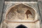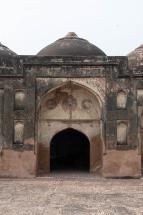 Subject: View of the mosque s central bay with a prominent pointed arch, traces of painted medallions in the spandrel, and a large central dome rising above