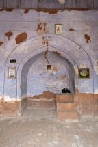 Subject: Mosque interior, east wall, west face, semi-domed central mihrab within an arch topped by entablature, and minbar