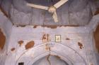 Subject: View of the mosque s left bay with a pointed arched entrance, faded stucco ornamentation, and a shallow dome above