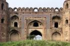 Subject: General view of the south facade of the Southern Gateway (Delhi Darwaza), semi-domed high alcove with central passageway flanked by projecting balconies and topped by battlemented parapet