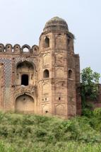 Subject: View of the right wing of the south facade of the Southern Gateway (Delhi Darwaza) flanked by projecting balconies and engaged turret